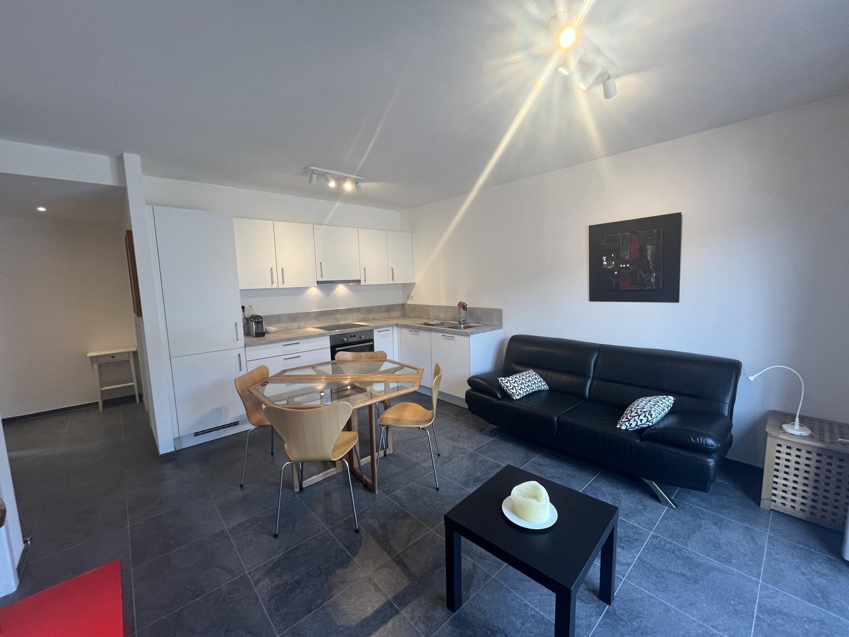 Comprend: 1 hall, 1 cuisine (très bien équipée avec frigo, taque, hotte, four, lave-vaisselle, nombreuses armoires), salon (avec canapé, terrasse meublée (9m2), grande chambre séparée (lit 160cm et bureau), salle de bains (meuble lavabo, douche wc suspendu, lessiveuse et sèche-linge), débarras.