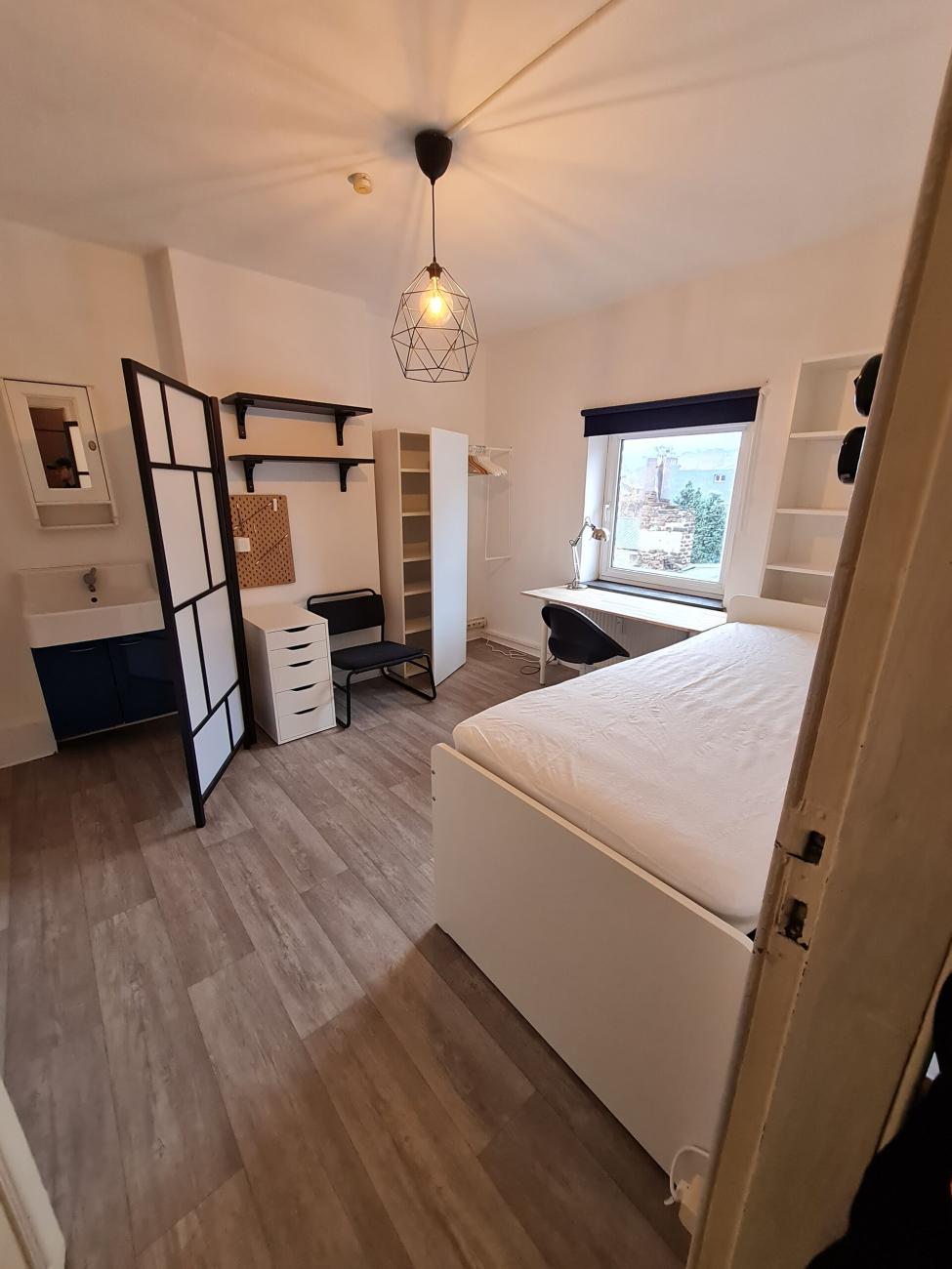 Dans un duplex de + de 100m2, à Angleur (Renory) idéalement situé pour se rendre au Sart-Tilman ou au centre ville, une chambre pour étudiant dans une ancienne maison de maître divisée en deux logements, située au 2ème étage calme, agréable et confortable. Lit une personne, meublée d'une armoire, d'un bureau, d'une chaise, un évier individuel, étagère. Sanitaires et cuisine neuve entièrement équipée à partager avec deux autres étudiants.