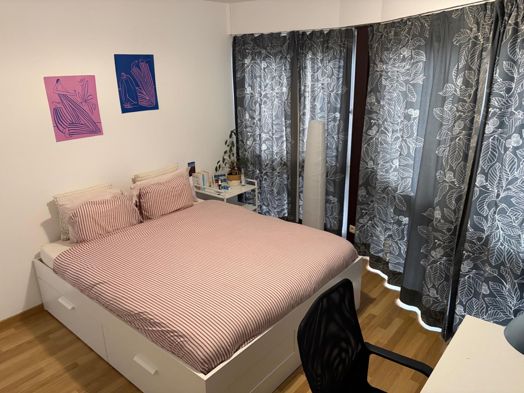 Libre : une grande chambre de +/- 12. 8 m2 ; moyennant accord à prendre avec l'étudiante en partance, possibilité d'acquérir armoire, commode et desserte/table de nuit, dans un état impeccable, pour respectivement 100€, 50€ et 10€.