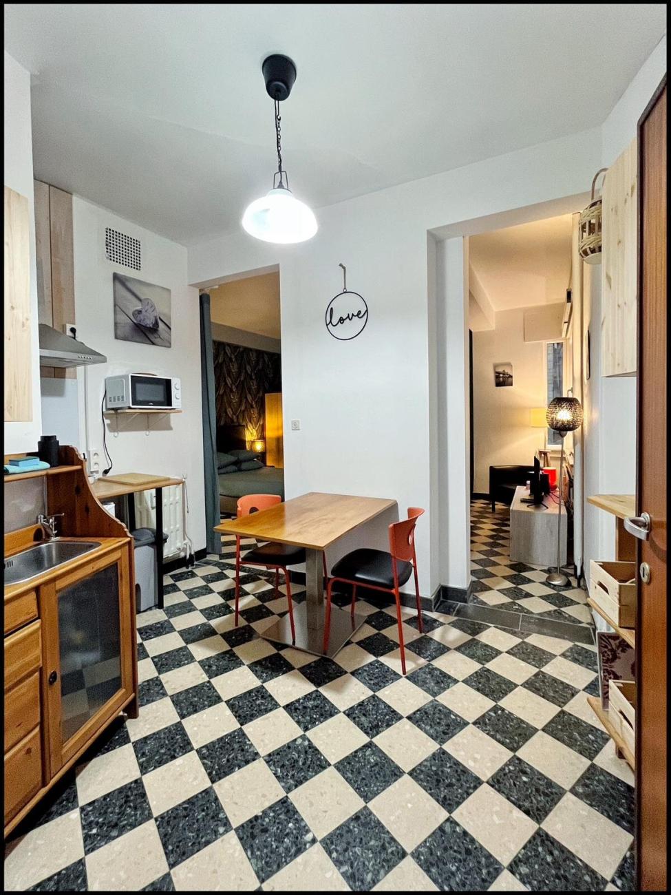 Équipements : réfrigérateur, micro-onde, taques de cuisson, hotte, grille-pain, machine à café, TV, sèche-cheveux, planche à repasser...