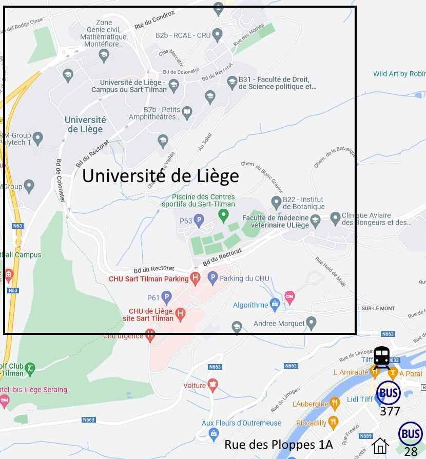 - Campus du Sart Tilman, médecine et vété à 10 minutes en bus (ligne 28) et 5 minutes en voiture.