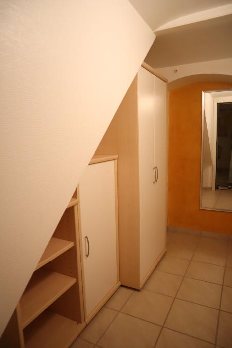 Ce kot est composé d'une chambre avec un petit débarras, d'un espace séjour avec cuisine équipée et bureau, d'une salle de douche ainsi qu'une toilette et un hall d'entrée.