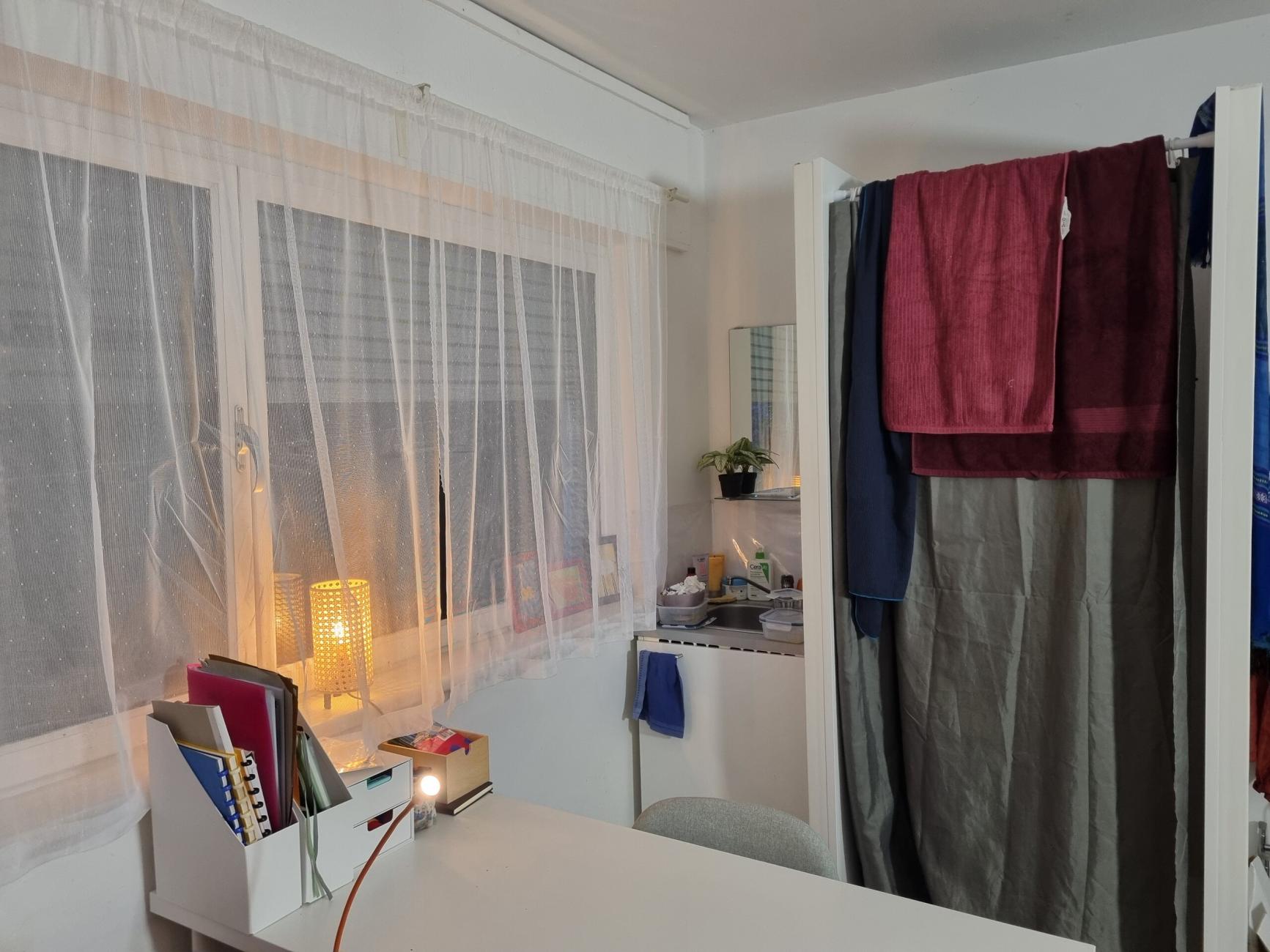 Pour ce qui est de la chambre, elle est assez grande avec lit double, douche, évier, armoire, bureau et de quoi cuisiner (frigo, taque cuisson, micro-onde). Les fenêtres sont assez grandes et possède des stores.