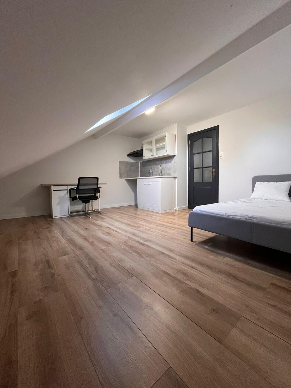 🛏️Chambre 4 au 2ème étage (19 m²) : Lit double avec matelas et oreillers, bureau+espace de rangement, chaise ergonomique, lampe de bureau. 💶 Prix: 485€