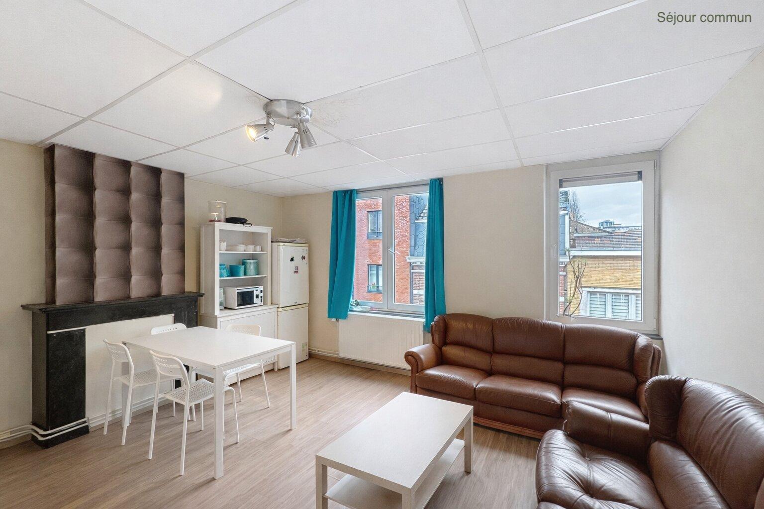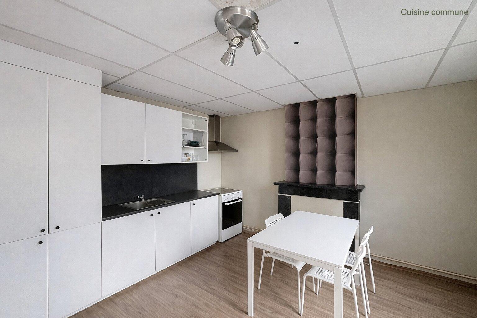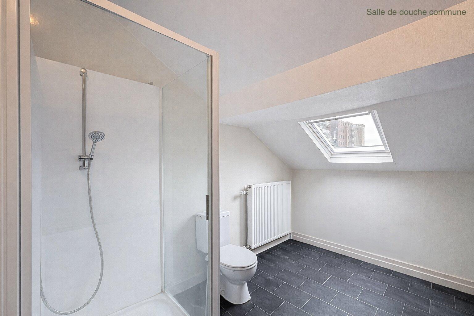 Les espaces communs comprennent un séjour lumineux avec cuisine équipée, un WC ainsi qu’une salle de douche, partagés entre les colocataires.