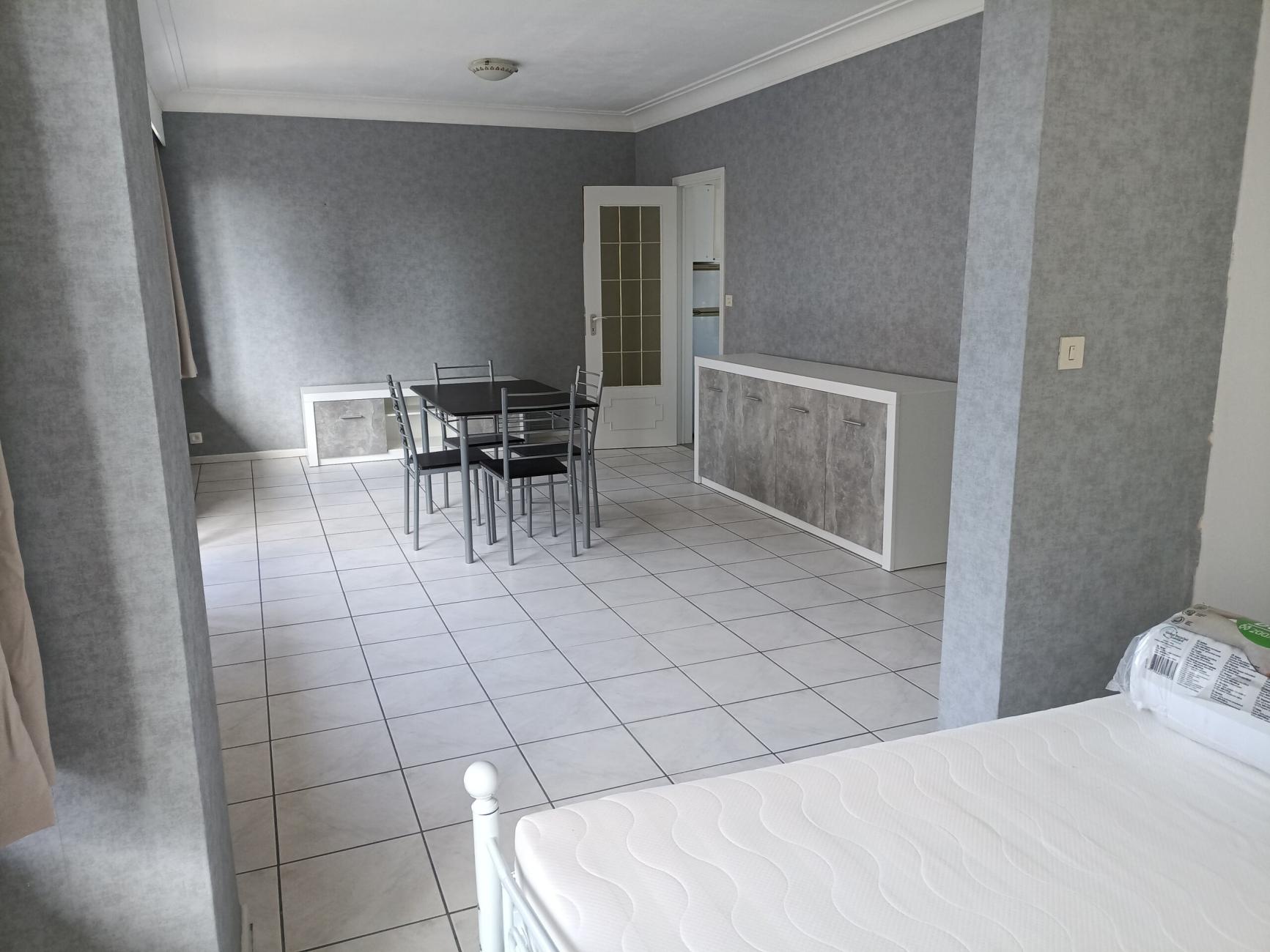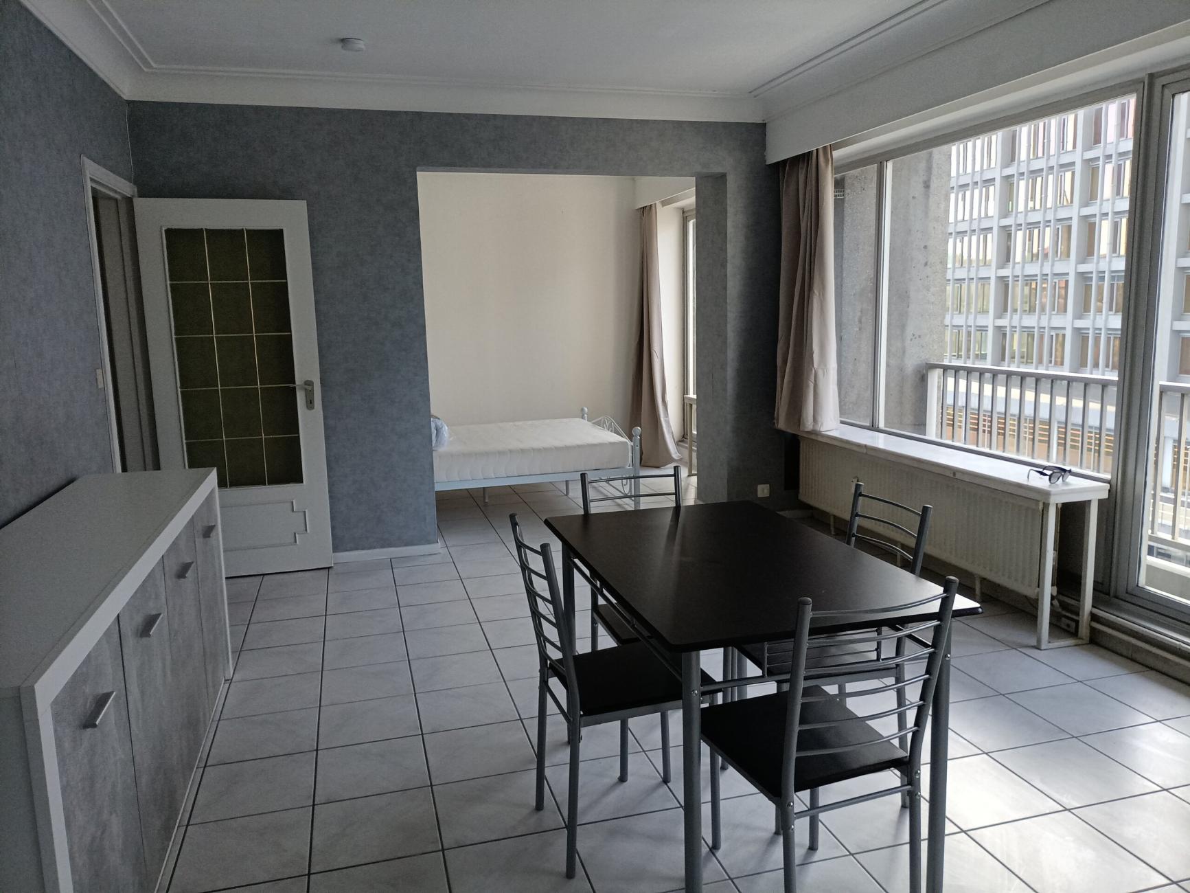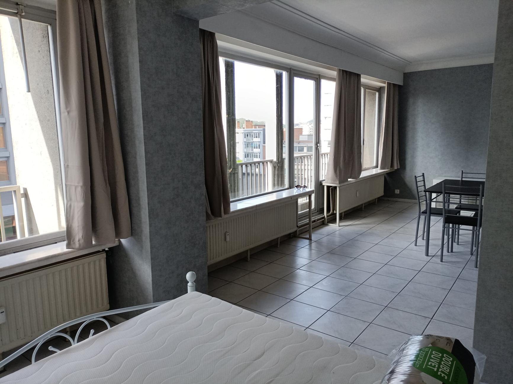 Très beau STUDIO entièrement meublé et équipé, situé au 2ème étage, à la résidence Kennedy, dans l'hyper centre de Liège. Porte blindée et coupe feu neuve, installation électrique conforme. La pièce principale possède une table à manger avec 4 chaises, un bahut, meuble TV. La partie adjacente (nuit) est composé d'un lit 2 personnes. La salle de bain est constituée d'une baignoire, WC, évier et meuble salle de bain. Cuisine équipée: évier, plan travail, micro-ondes, taque électrique, hotte, frigo, four, casseroles/assiettes/verres/couverts fournis. A l'entrée on retrouve un portemanteau et un meuble pour les chaussures.
