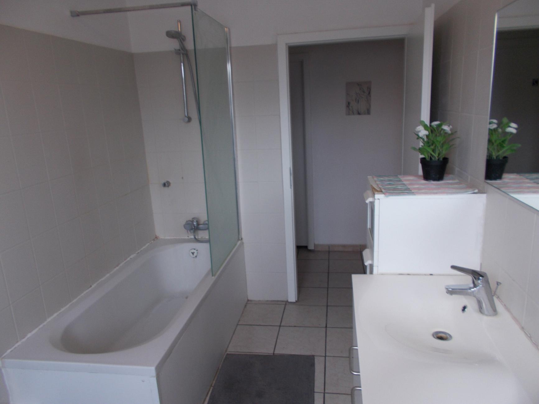 Salle de bain, baignoire, douche, wc, double lavabos. Rangements.