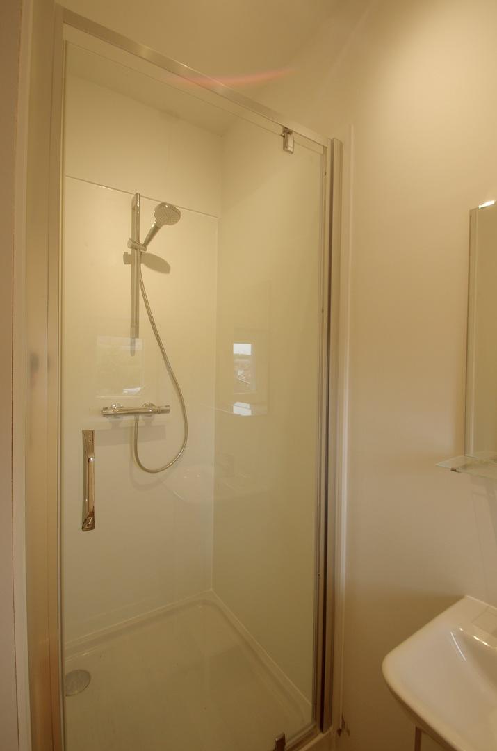 Espace chambre et douche privée, la chambre est entièrement meublée avec un lit complet de 90cm, une garde robe avec tiroir et tringle, un bureau avec étagère et une chaise. Une pièce douche privée et un meuble évier avec miroir.