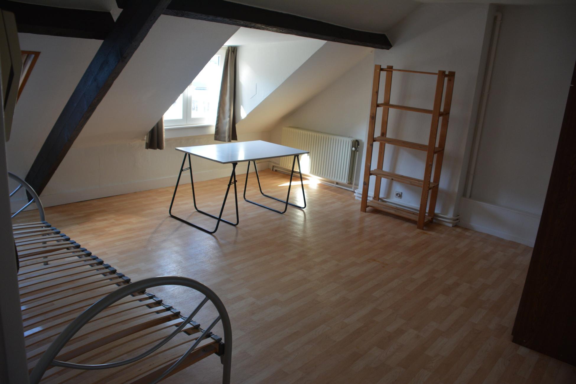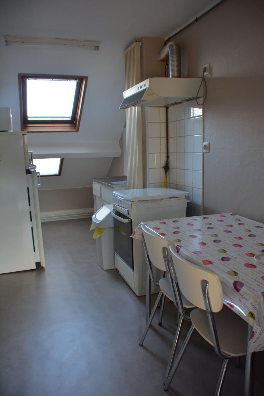 4eme étage arrière : 24 m2, meublée (cadre de lit 1 personne sans matelas, garde-robe, bureau, chaise de bureau, étagère ), lavabo eau chaude et froide. La cuisine est partagée par 2 étudiants
