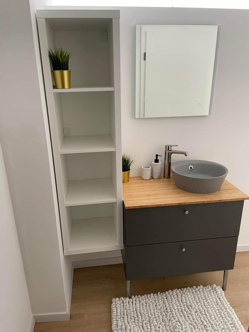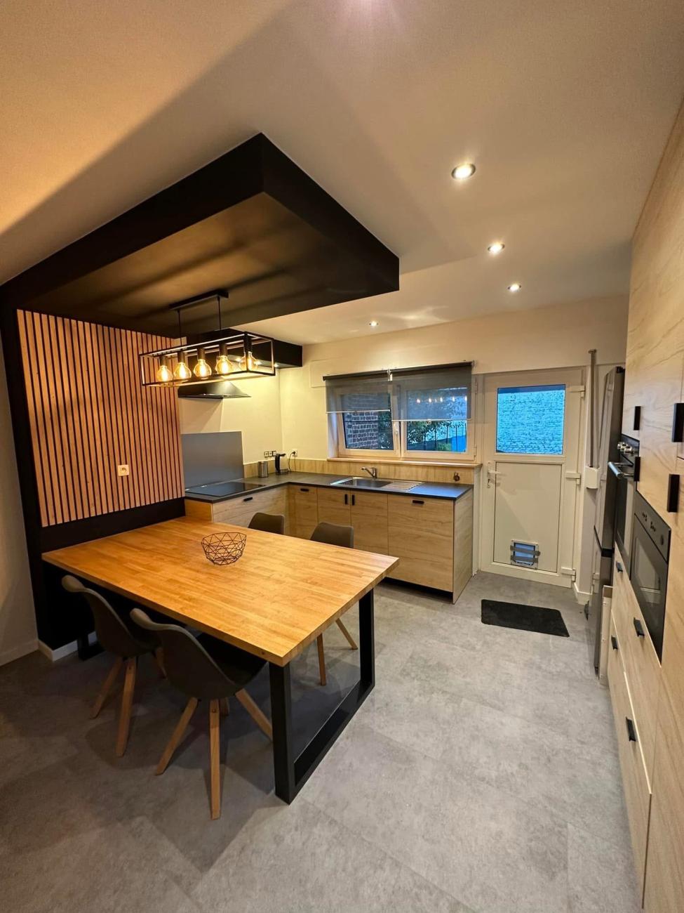 Nouvelle cuisine équipée : frigo, congélateur, four, micro-ondes, taques induction, évier, hotte, lave-vaisselle, nécessaire de cuisine et vaisselle de table…