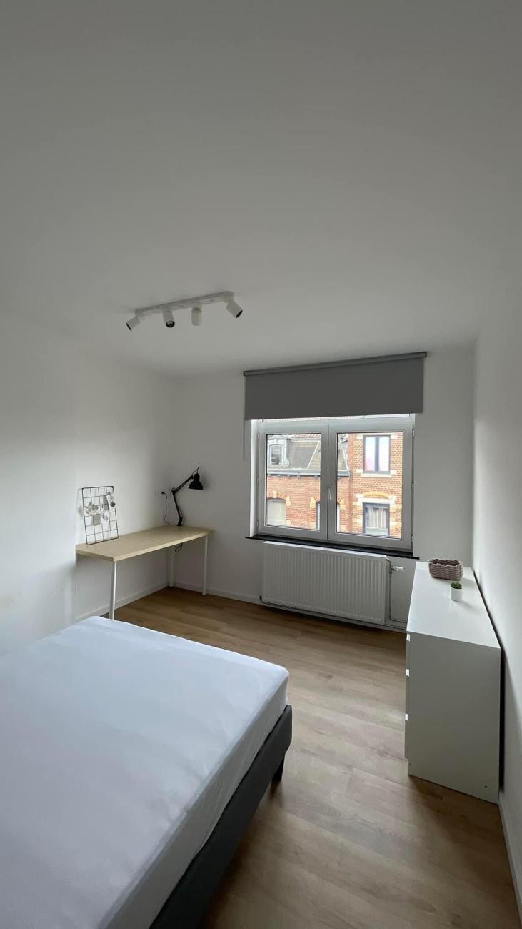 Chambre lumineuse meublée 2è étage. SDB, cuisine et WC à partager avec la deuxième chambre. Espace commun, terrasse et machine à lessiver au 1é étage
