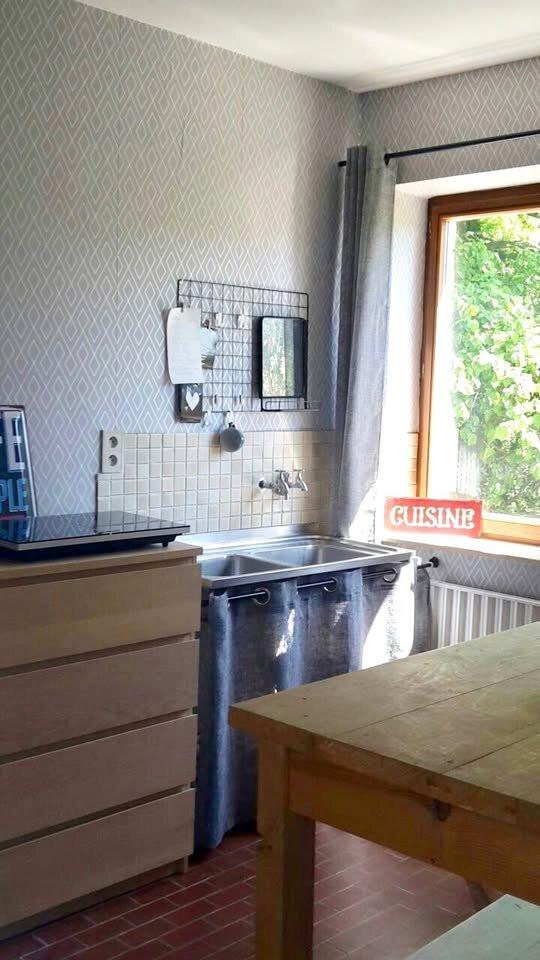 Partiellement meublé (cuisine, frigo, table, lit, étagères,... )