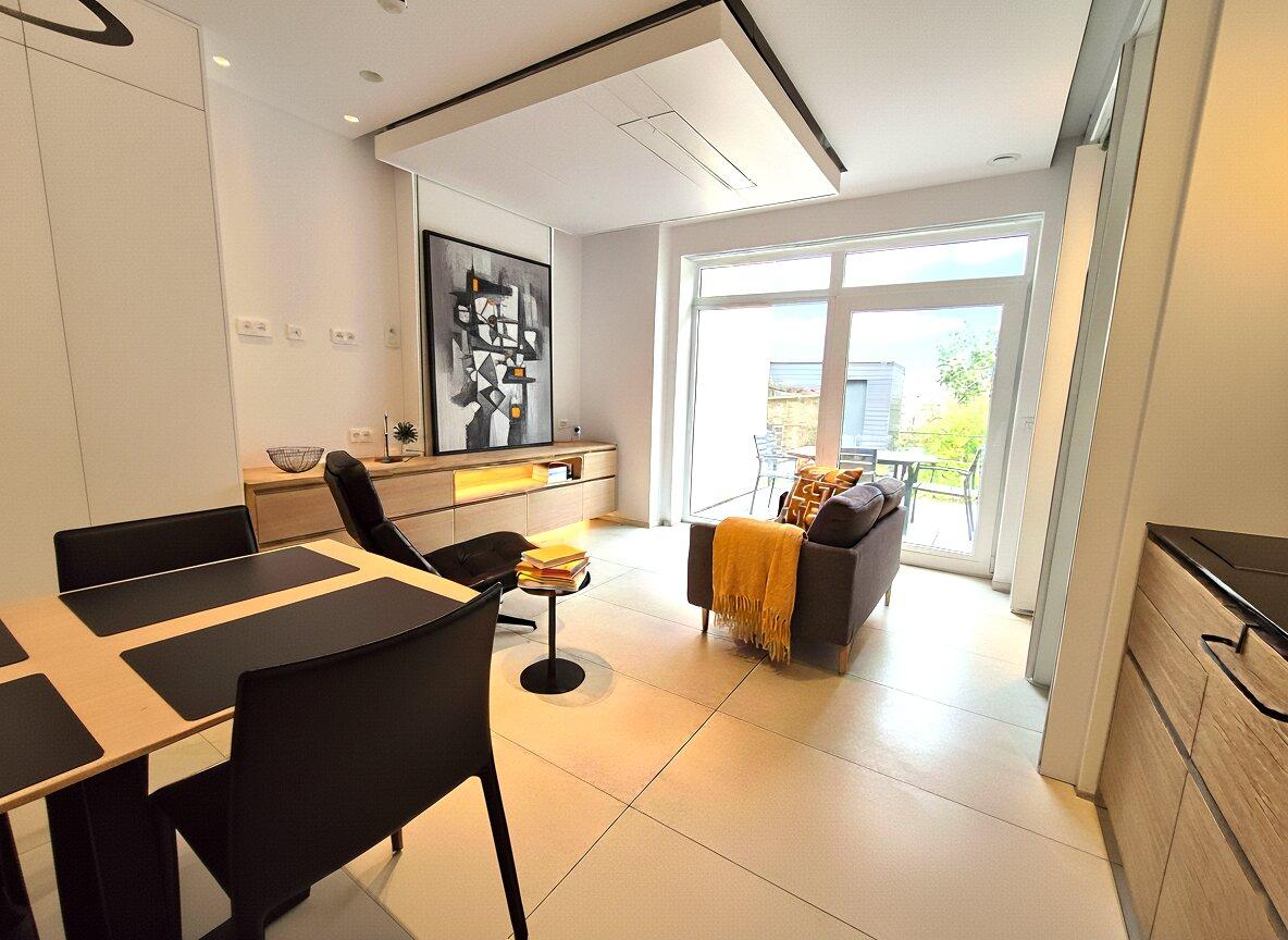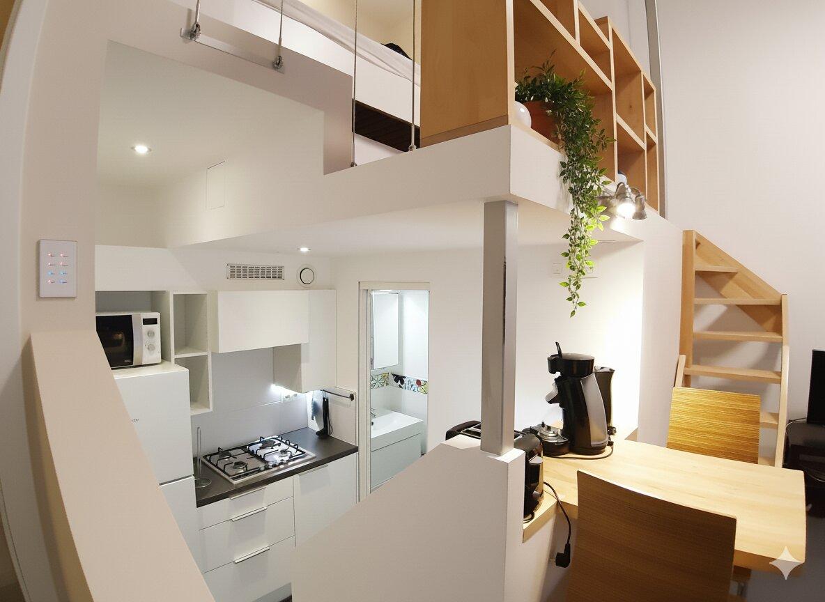 Super studio pour une ou deux personnes, totalement meublé et équipé. Petit sas d'entrée avec meuble à chaussures et porte manteau ainsi que la porte de la salle de bain. Grande pièce de vie avec chambre à l'écart quasiment séparée. Petite terrasse privée.