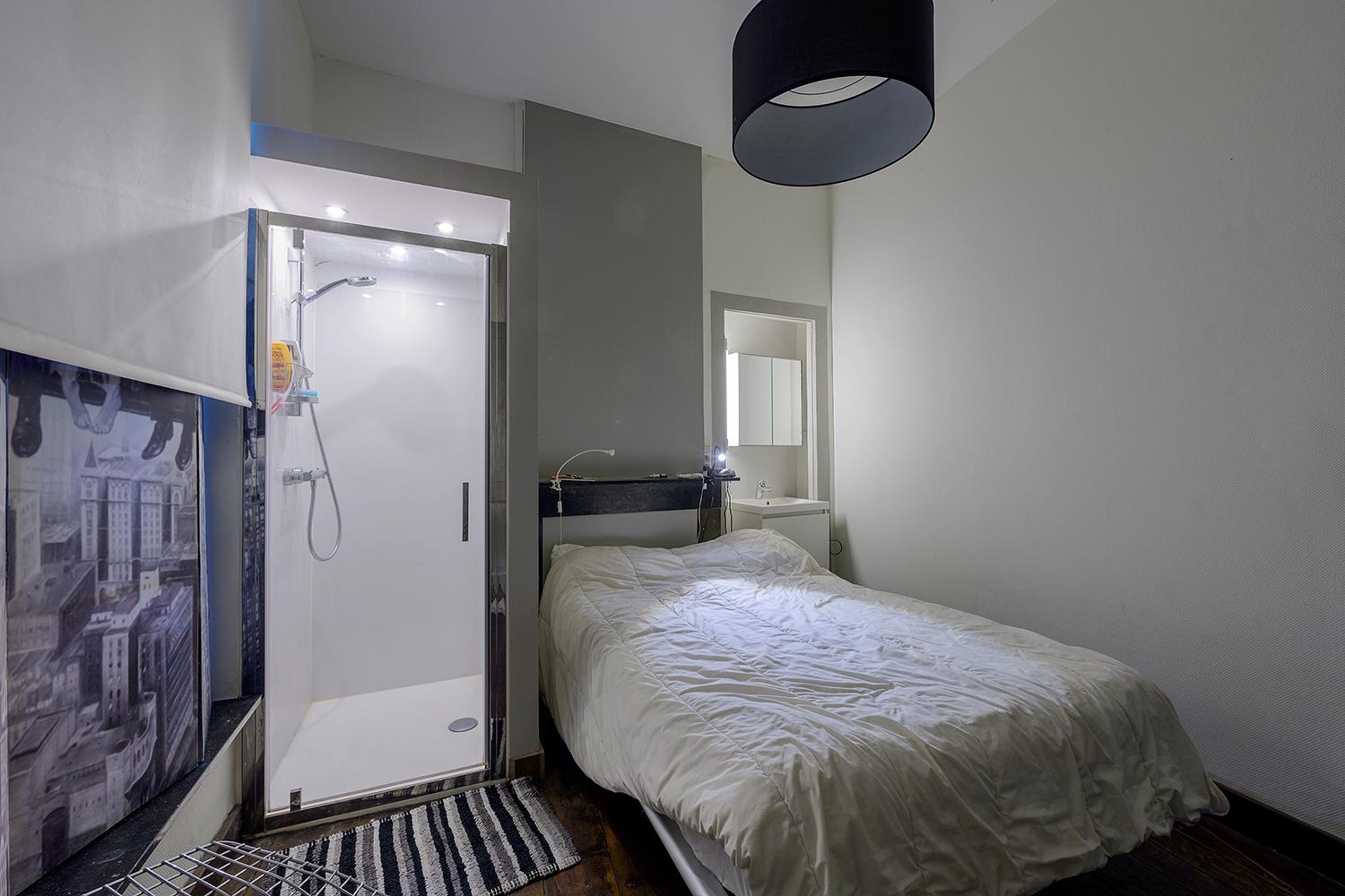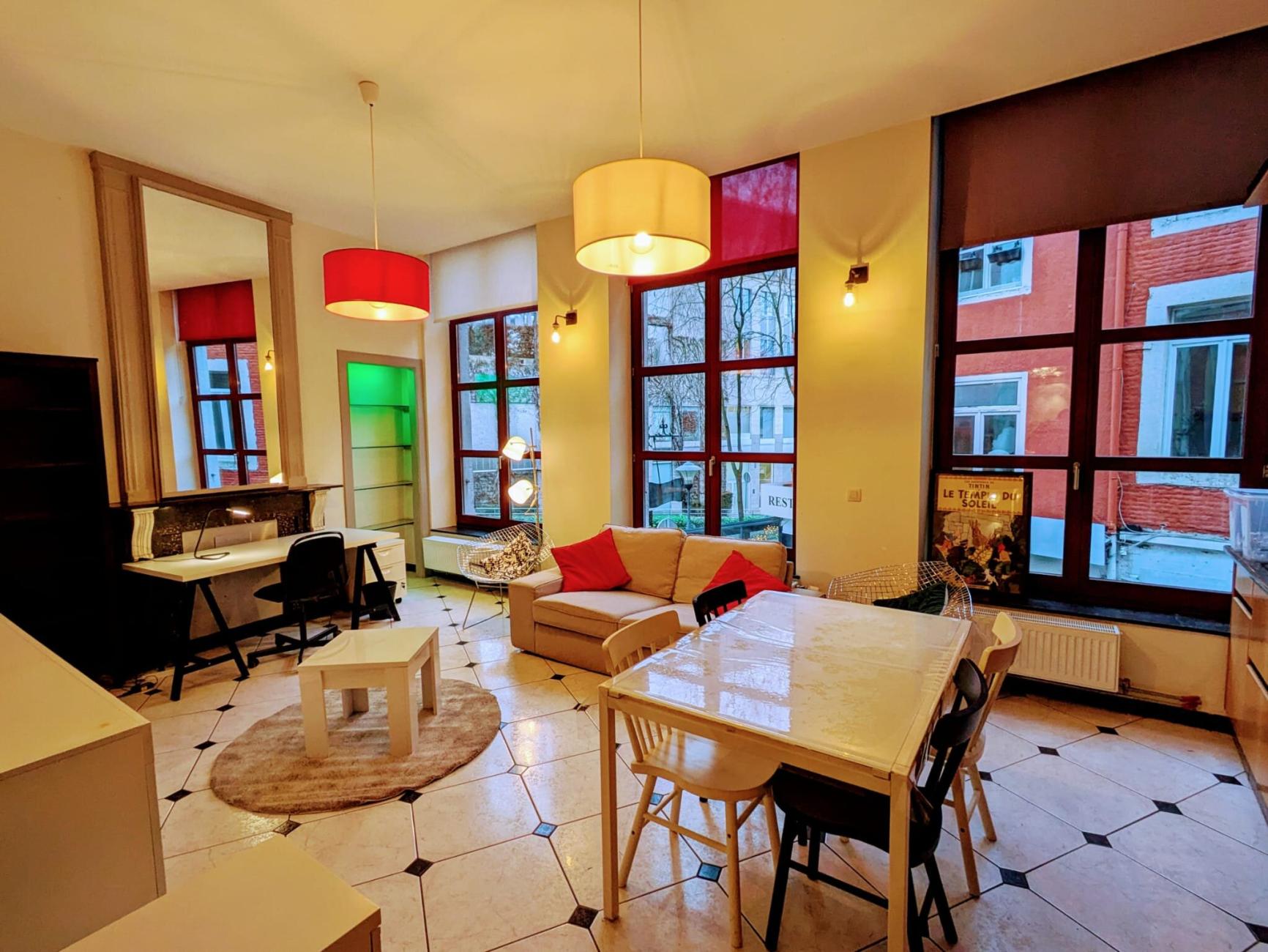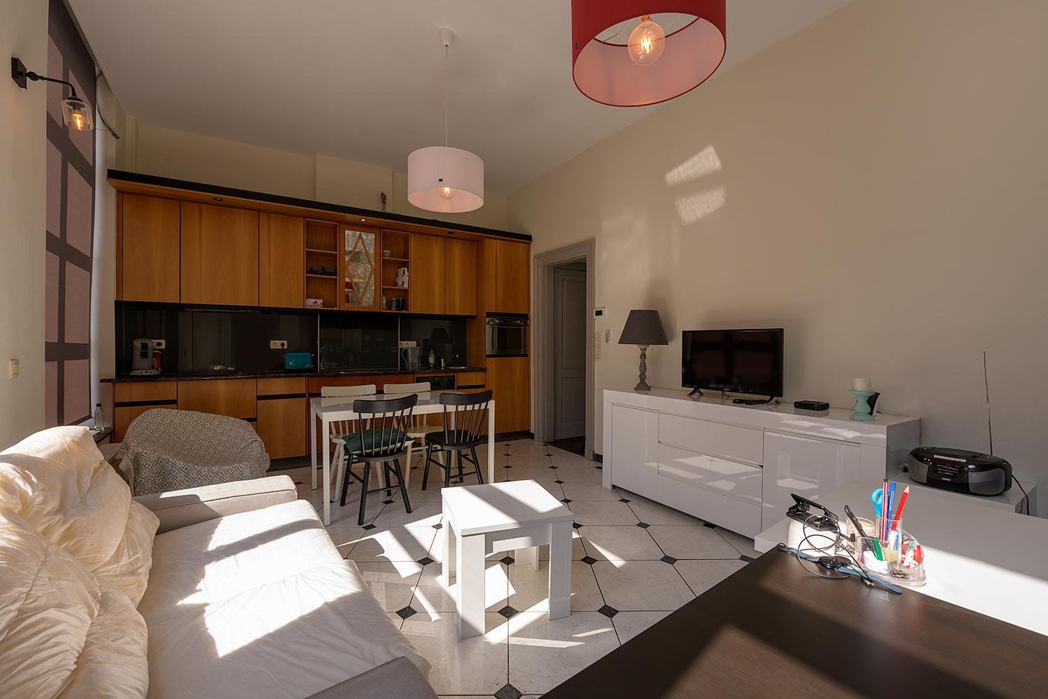 Entièrement meublé avec une cuisine très bien équipée (LV, four combi, plaque vitro, vaisselle) avec îlot central donnant sur le living, un hall d'entrée et une chambre avec un lit 2 personnes et douche.