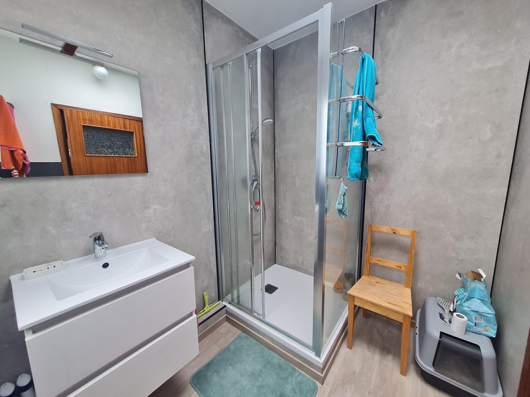 Sanitaires et cuisine neuve entièrement équipée à partager avec deux autres étudiants.