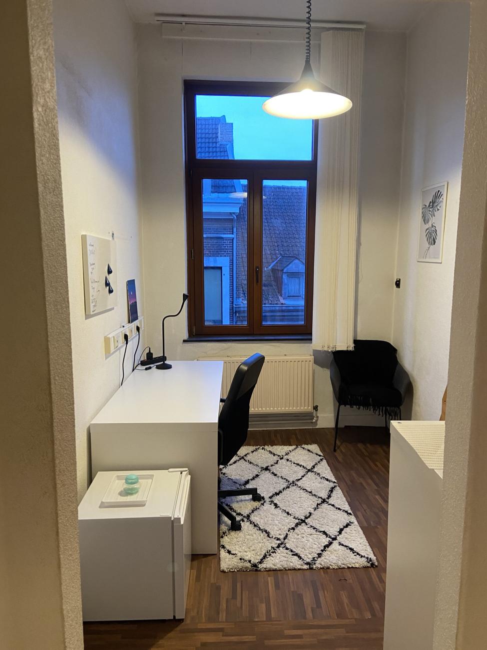 Kot en parfait état réservé aux étudiants de l'enseignement supérieur dans un immeuble de 3 étages situé dans un quartier classé. Récemment des investissements énergétiques ont été effectué. La chambre est lumineuse et complètement équipée avec une salle de bain privée, bureau, garde-robe et lit. Chaque étage a une (nouvelle) cuisine commune équipée avec une cuisinière, four, micro-onde, frigos, congélateur, etc. De plus, il y a une machine à laver et sechoir dans la cave. Les communs sont nettoyés chaque semaine par une entreprise professionnelle.