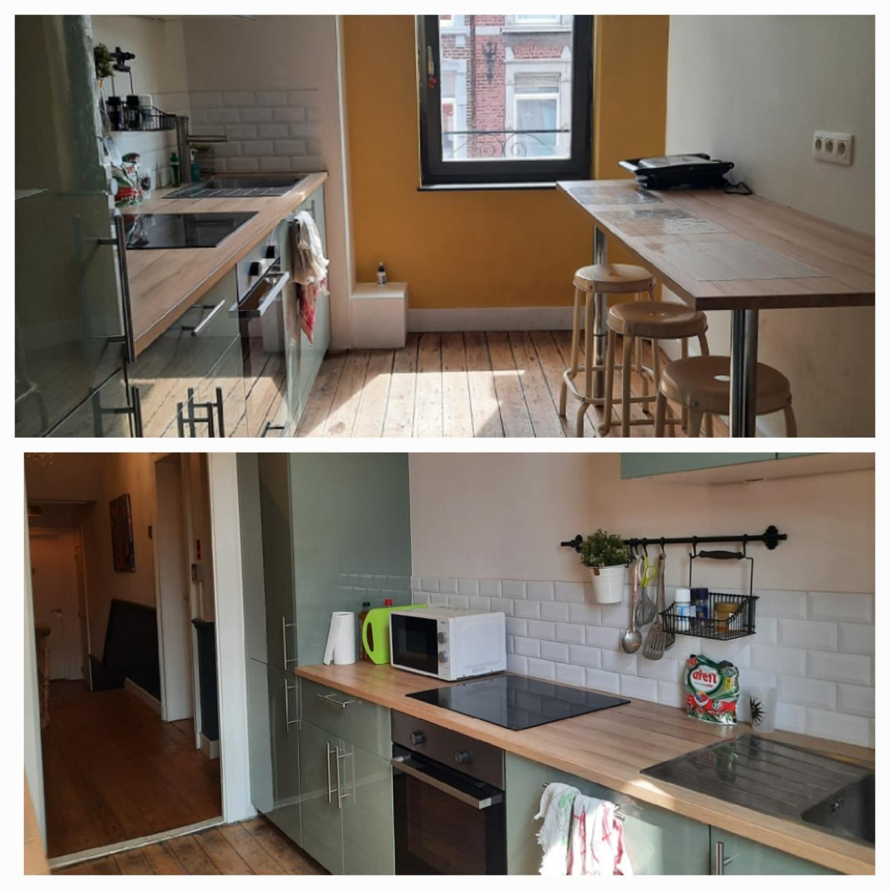 - La cuisine parfaitement équipée, commune pour trois étudiants, comprend un grand frigo et congélateur, 4 plaques de cuisson à inductions, un lave-vaisselle, un micro-onde, un grille pain, divers équipements, vaisselles etc