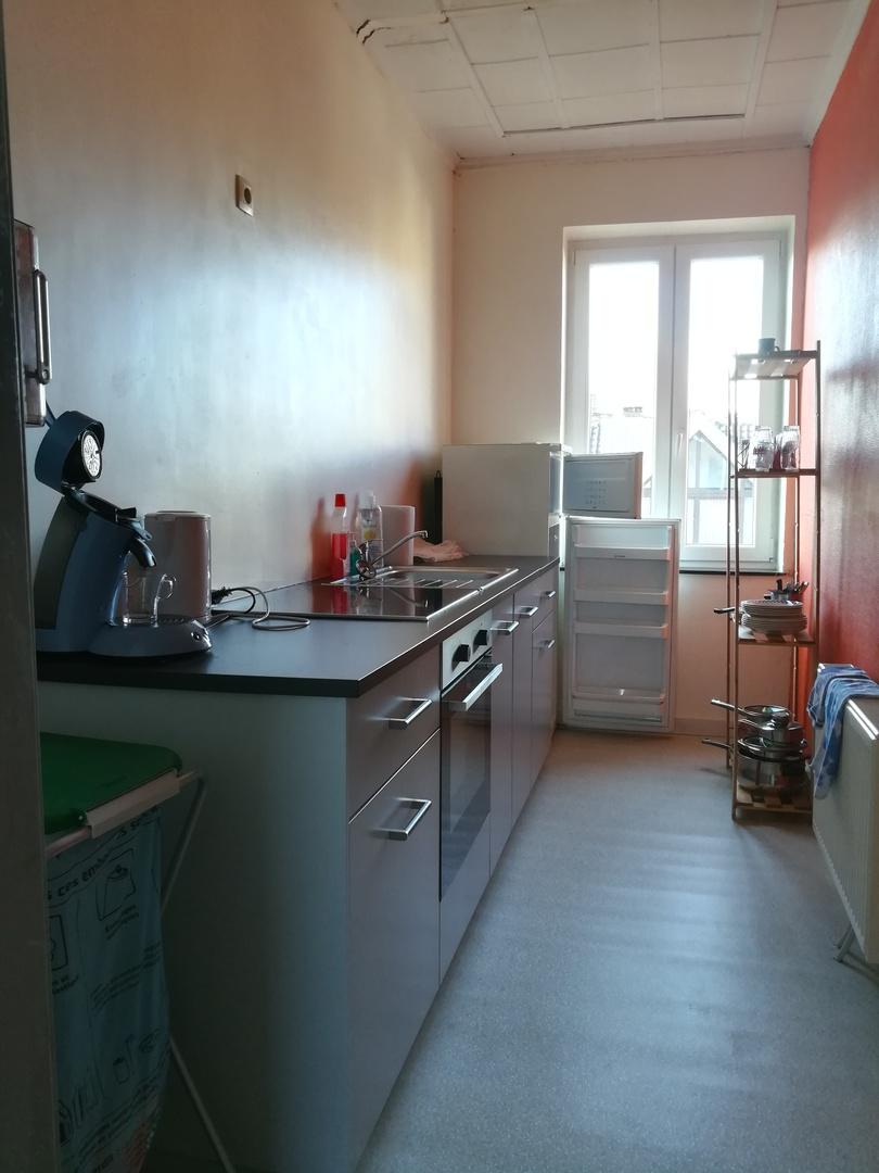 L'appartement est composé d'une cuisine équipée à partager (four, vitrocéramique, micro-ondes, frigo), de deux chambres meublées (lit, bureau, chaise de bureau et garde-robe) et d'une salle de douche commune (cabine de douche, WC, lavabo).